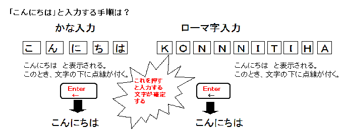 「ローマ字入力」または「かな」入力で、文字を入れ、Enterキーで確定します。