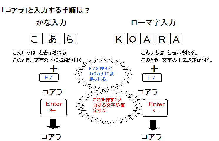 (方法2)ファンクション・キーを使う。 文字を入力し、F7キーを押す。下記参照