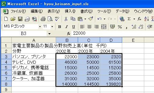 セル「B3」、「C3」、「D3」には、「22000」、「23000」、「23200」数値を書き込みます。