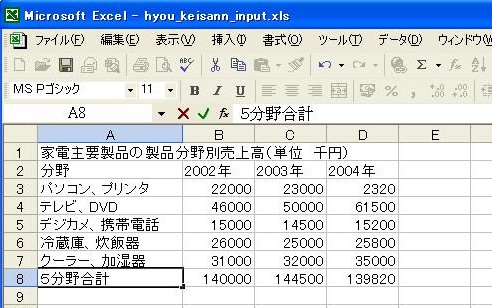 「D8」に2004年度の合計値が表示されます。