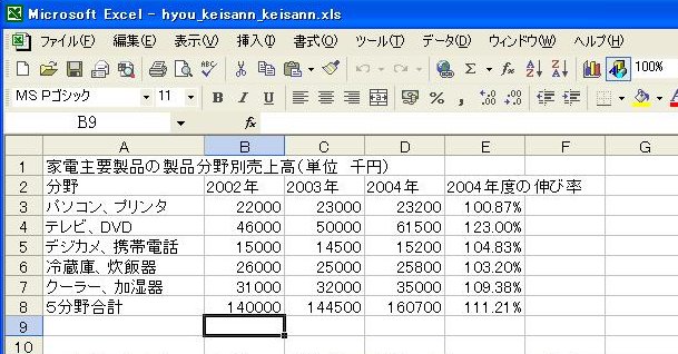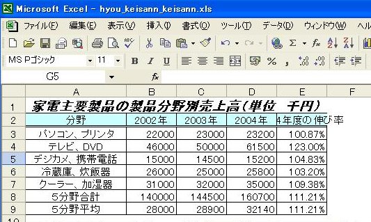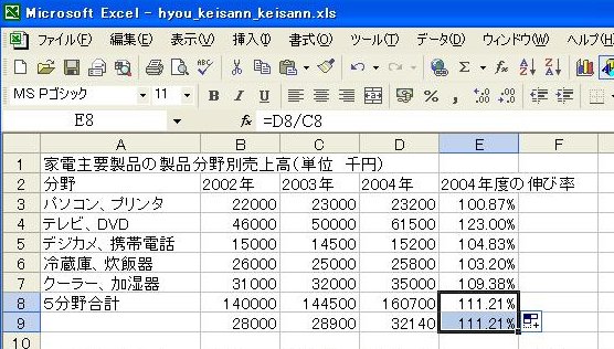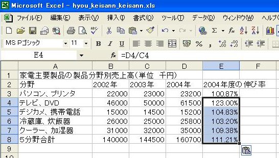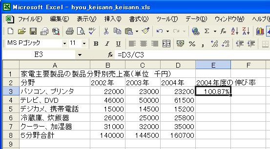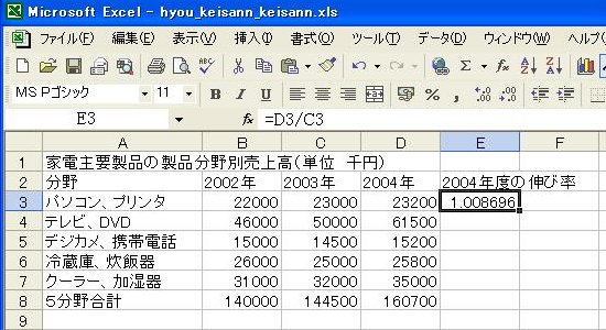 (1)2004年度の伸び率を表示するセル[E3]をクリックします。