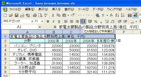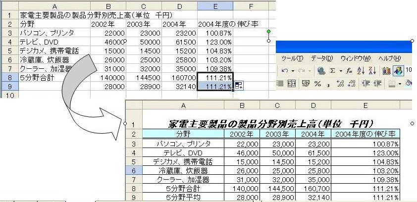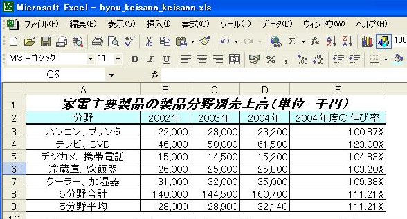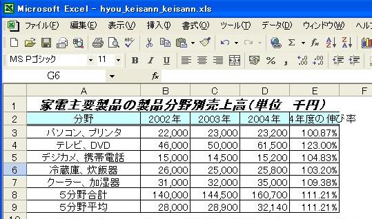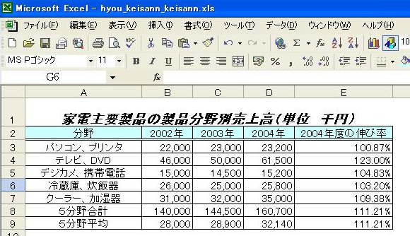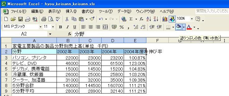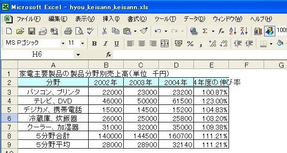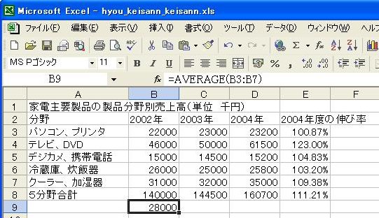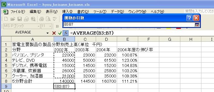 計算式が複写され、2003年度、2004年度の平均値が表示されます。