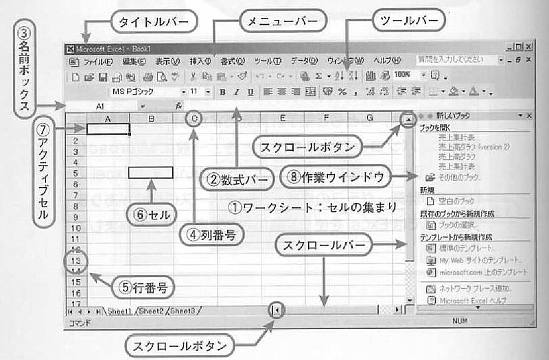 エクセルには、最大256枚のワークシートがあり、このワークシートの集まりをブックといいます。ブックは一冊のノートに、ワークシートはノートの各ページに相当します。