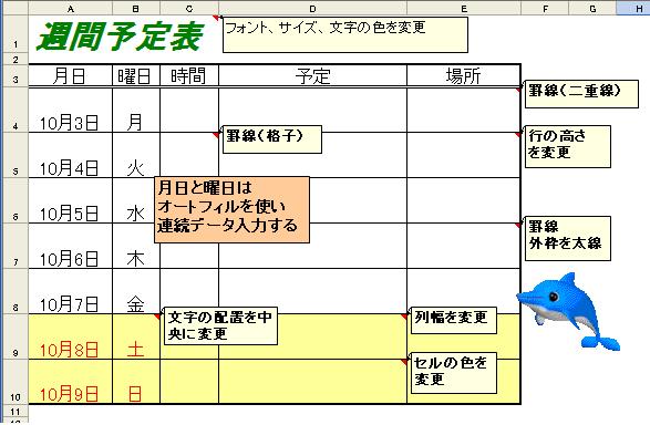 | ”週間予定表”のフォントを”HGPゴシックE”、フォントサイズを”36pt”に、 その他の文字フォントをサイズを”20pt”に変更する。pt(ポイント)とは、文字のサイズや線の太さを表す単位で、1ptは約0.35ミリです。 | |